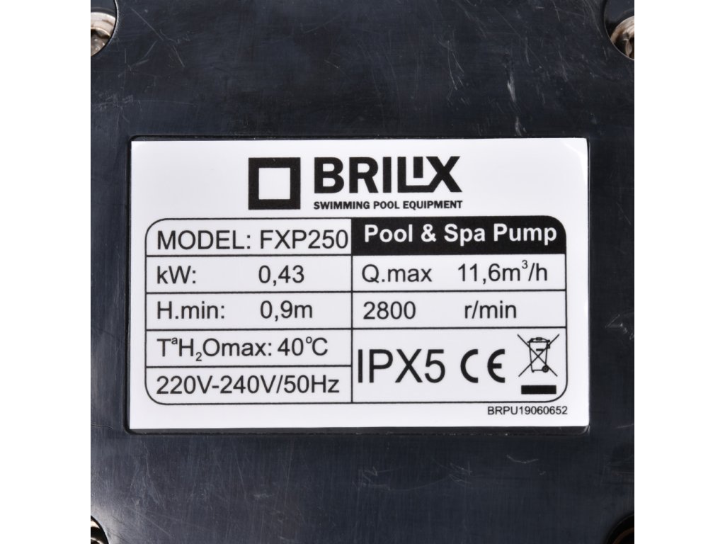 Bazénové čerpadlo FXP vhodné pro filtrační okruhy nadzemních i zabudovaných bazénů do objemu 25 m³. Bazénové čerpadlo FXP je ideální pro filtrační okruhy nadzemních i zabudovaných bazénů. Pumpa je spojena v monoblok s motorem a vlasovým předfiltrem polypropylenovým tělem, které má pro napojení sání a výtlaku šroubení k připojení lepením Ø50 mm. Vlasový předfiltr má průhledné víko a vyjímatelný koš. Motor je vybaven tepelnou pojistkou, která je instalována uvnitř vinutí. Čerpadlo není samonasávací.