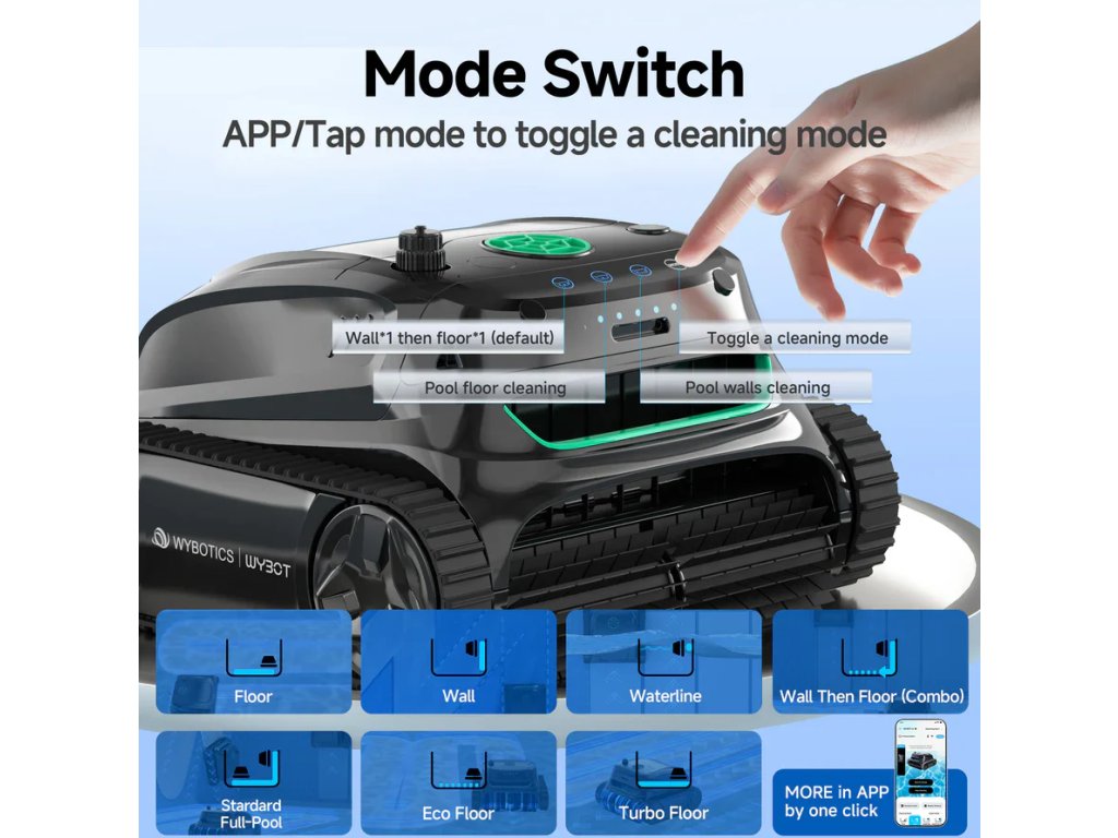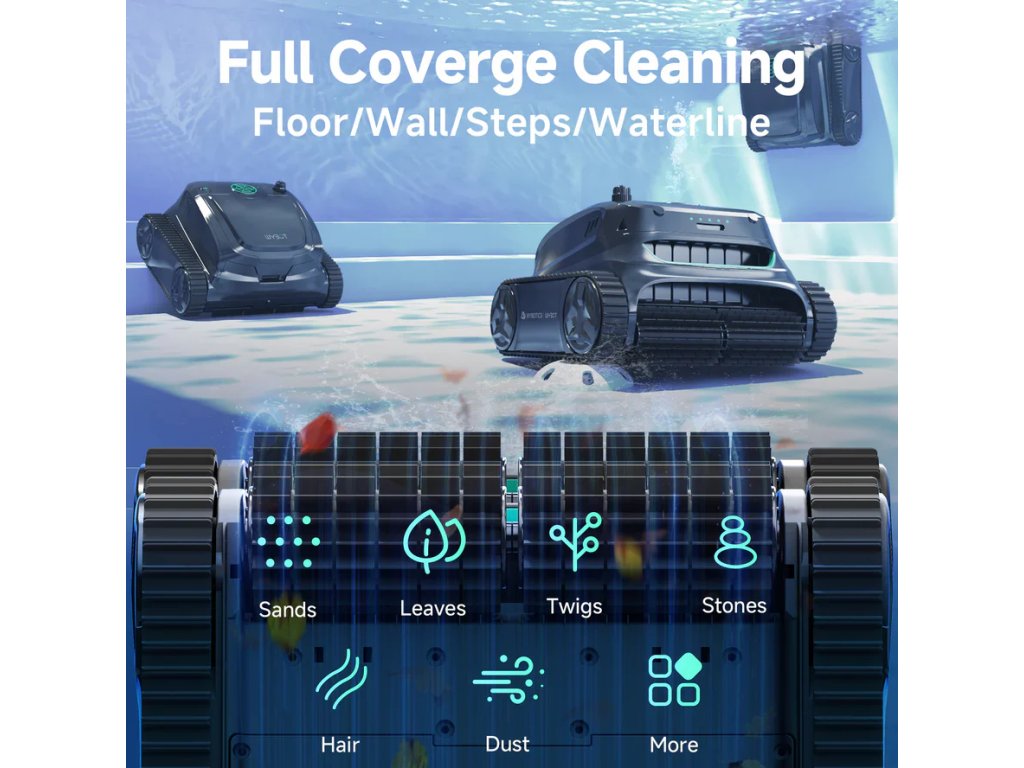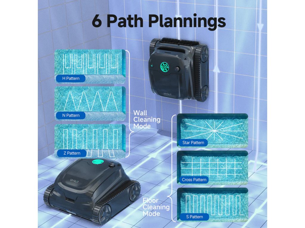 Díky inteligentnímu systému navigace s infračerveným senzorem dokáže WYBOT S2 analyzovat tvar bazénu v reálném čase a přizpůsobit pohyb tak, aby vyčistil opravdu každé místo. Bez problémů zvládá dno, stěny, schody i vodní linii, a to i v komplikovaných nebo asymetrických bazénech. S výdrží až 210 minut na jedno nabití si hravě poradí i s většími bazény o ploše do 300 m².
