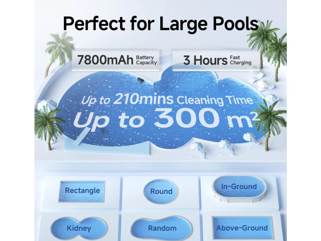 Díky robustní konstrukci a silnému sacímu výkonu je připraven na intenzivní každodenní provoz. Nabíjí se za pouhé 3 hodiny, zvládne hloubku až 3 m a pracuje spolehlivě i při nižších teplotách (od 5 °C). Pomocí mobilní aplikace lze nastavit až 7 čistících režimů a naplánovat automatické čištění podle potřeby.