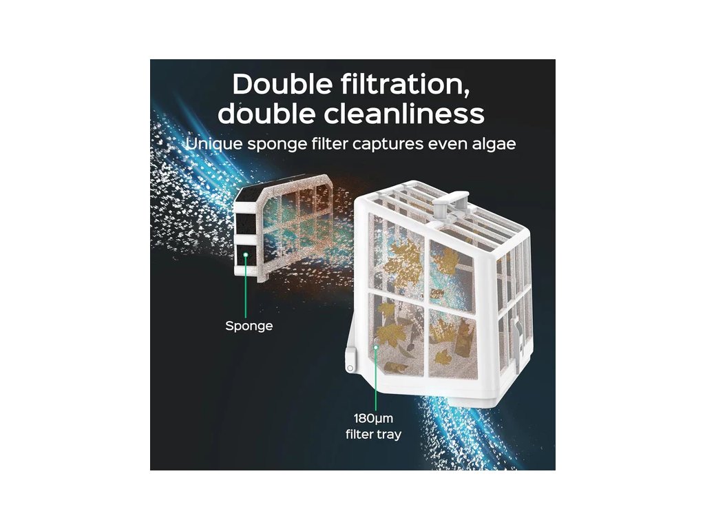 Vysavač WYBOT S2 je vybaven dvoustupňovým filtračním systémem, který spojuje jemný filtr o hustotě 180 μm s přídavným pěnovým filtrem 40 μm. Díky tomu dokáže zachytit vše – od větších nečistot, jako jsou listy a hmyz, až po nejjemnější prach a pyl. Filtrační koš se snadno vyjímá i čistí, takže se údržba stává rychlou a nenáročnou. Nechybí ani vysokorychlostní čisticí kartáč umístěný v přední části, který si poradí s různými povrchy, včetně betonu, fólie nebo polypropylenu.